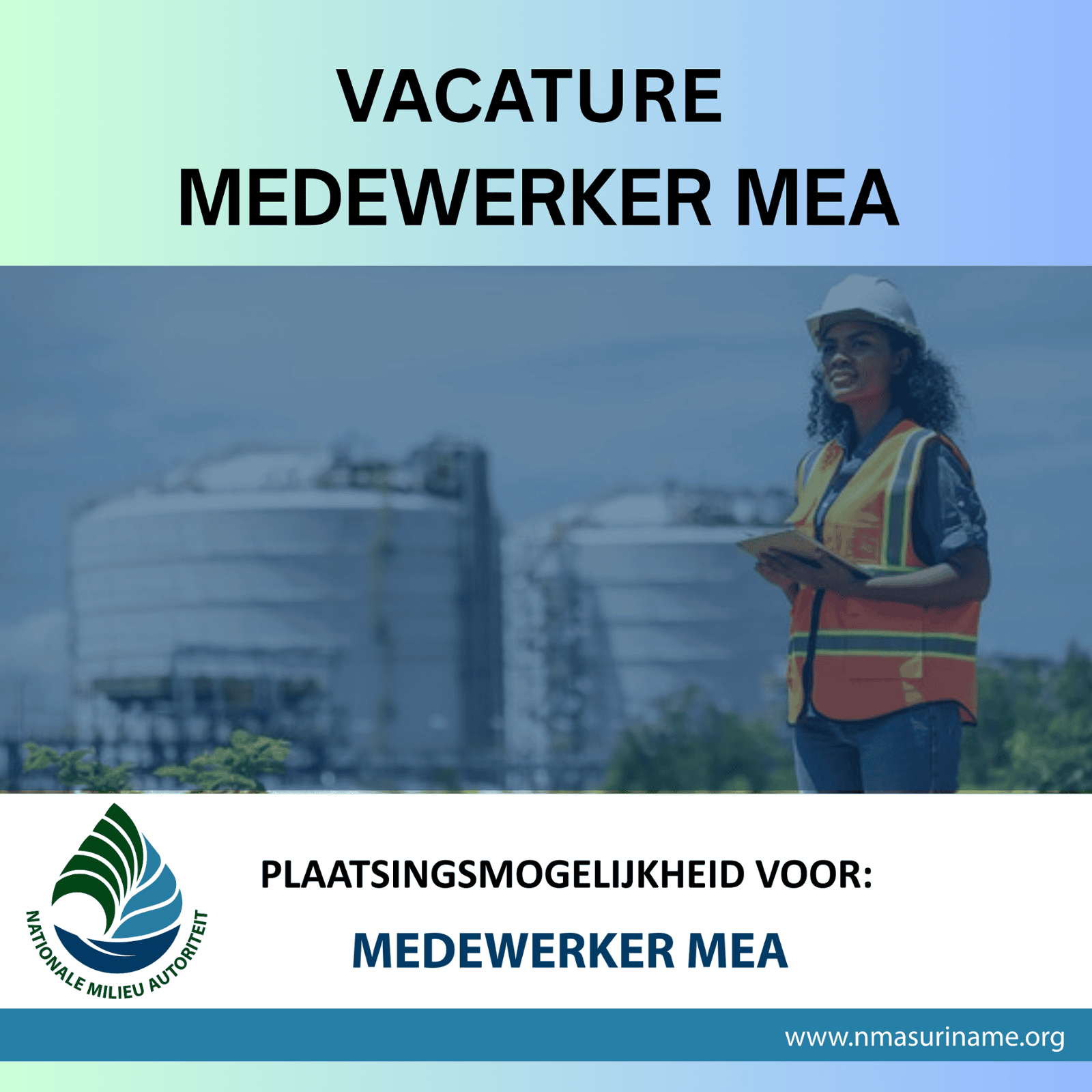 Stuur uiterlijk 31 oktober uw motivatiebrief en CV naar hrm@nmasuriname.org, t.a.v. de Directeur Nationale Milieu Autoriteit, mevrouw V. Gefferie, onder vermelding van
